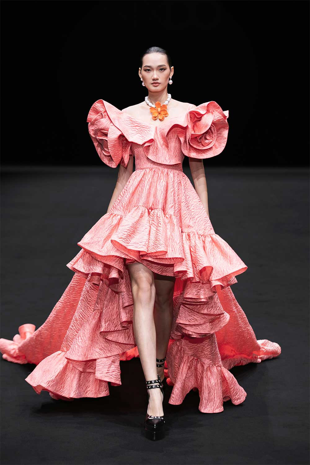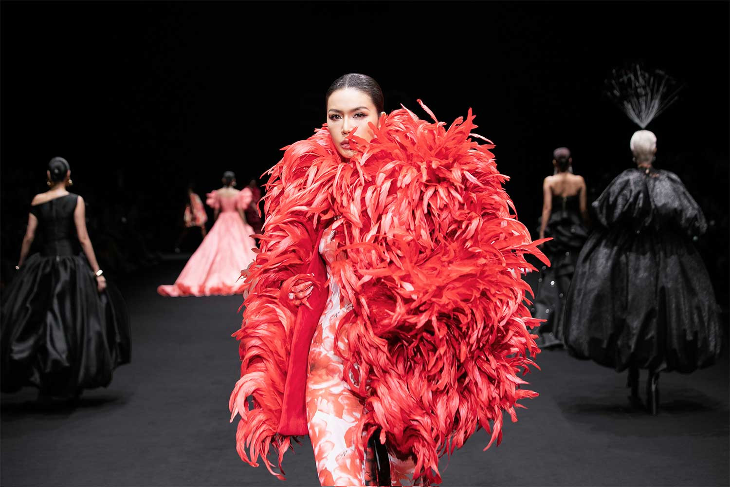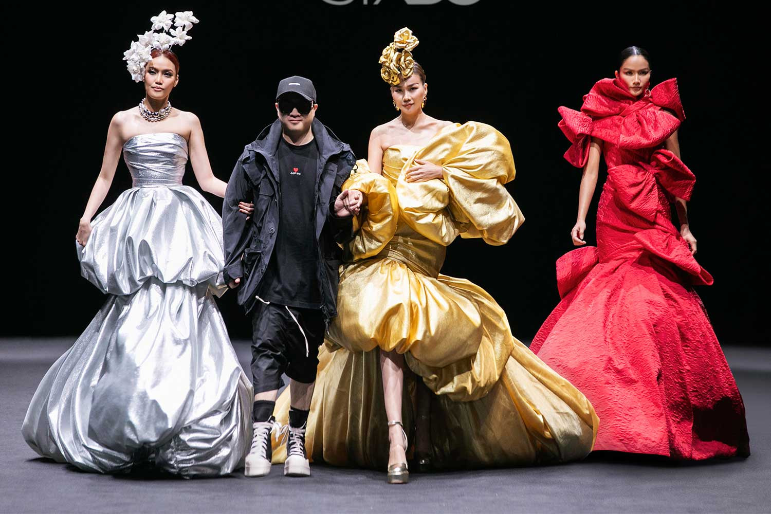 Hoa hậu H’Hen Niê mở màn show với thiết kế tua rua ấn tượng và trình diễn váy đỏ cầu kỳ. Thanh Hằng giữ vai trò vedette, diện đầm vàng kim nặng 15kg, được Đỗ Mạnh Cường tạo phom theo cấu trúc bất đối xứng.
