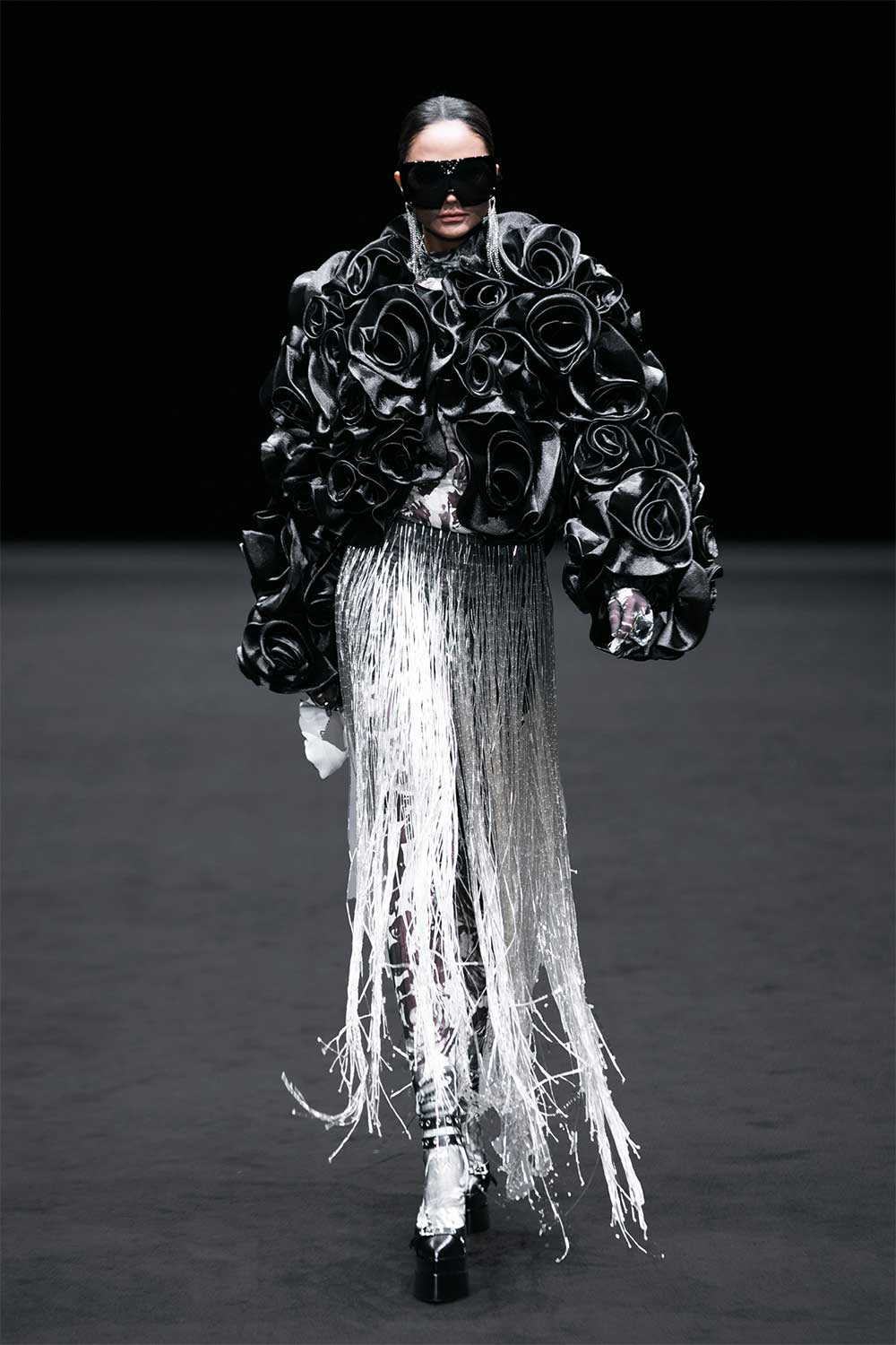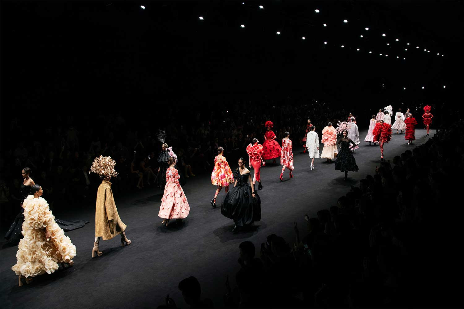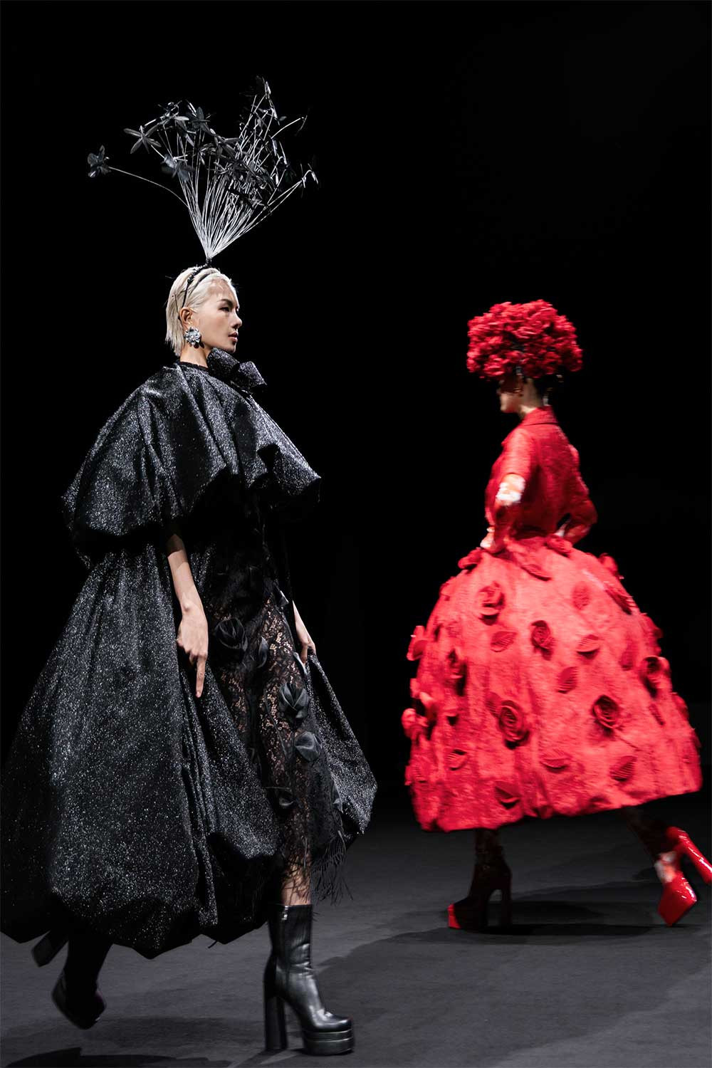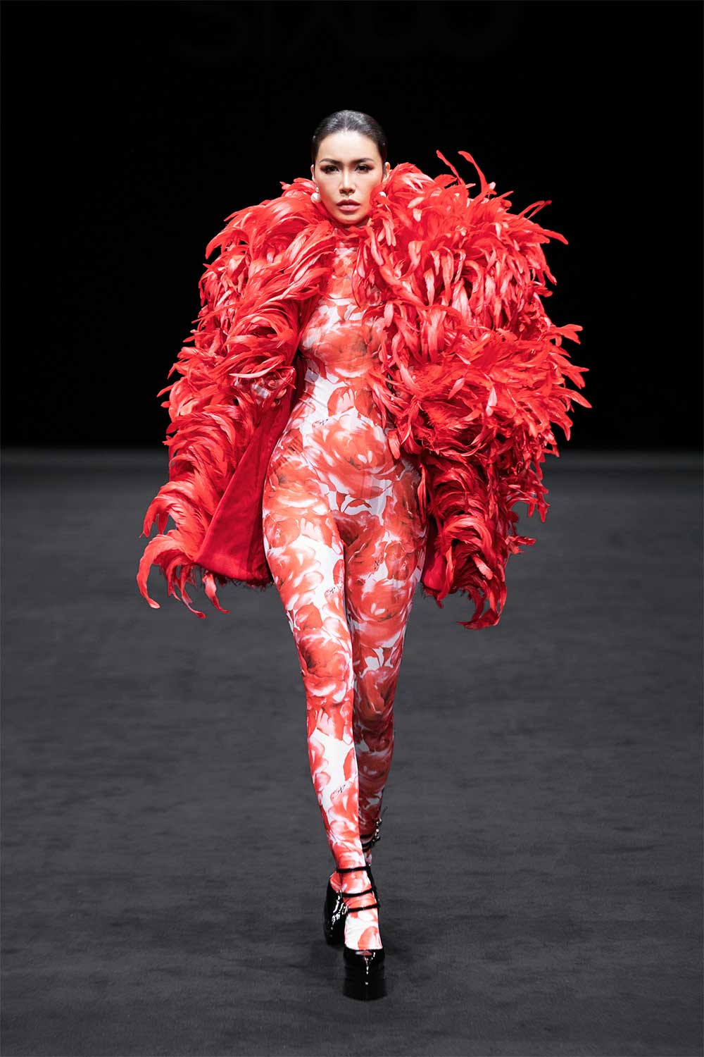 Hoa hậu H’Hen Niê mở màn show với thiết kế tua rua ấn tượng và trình diễn váy đỏ cầu kỳ. Thanh Hằng giữ vai trò vedette, diện đầm vàng kim nặng 15kg, được Đỗ Mạnh Cường tạo phom theo cấu trúc bất đối xứng.