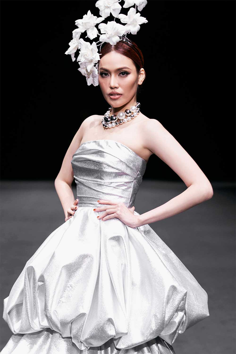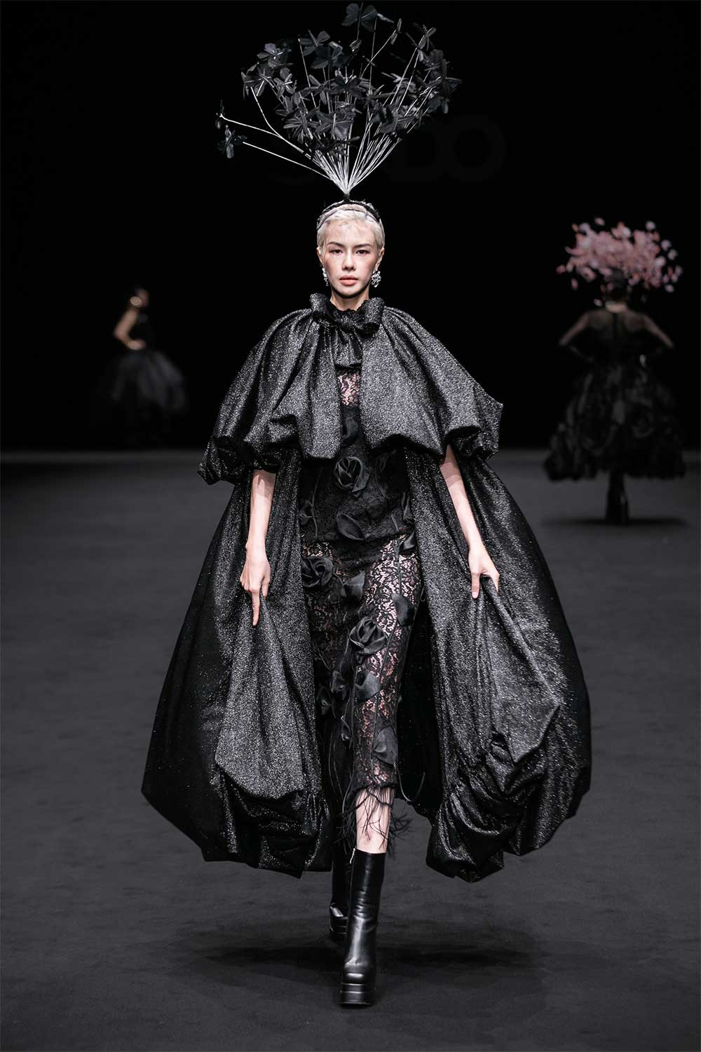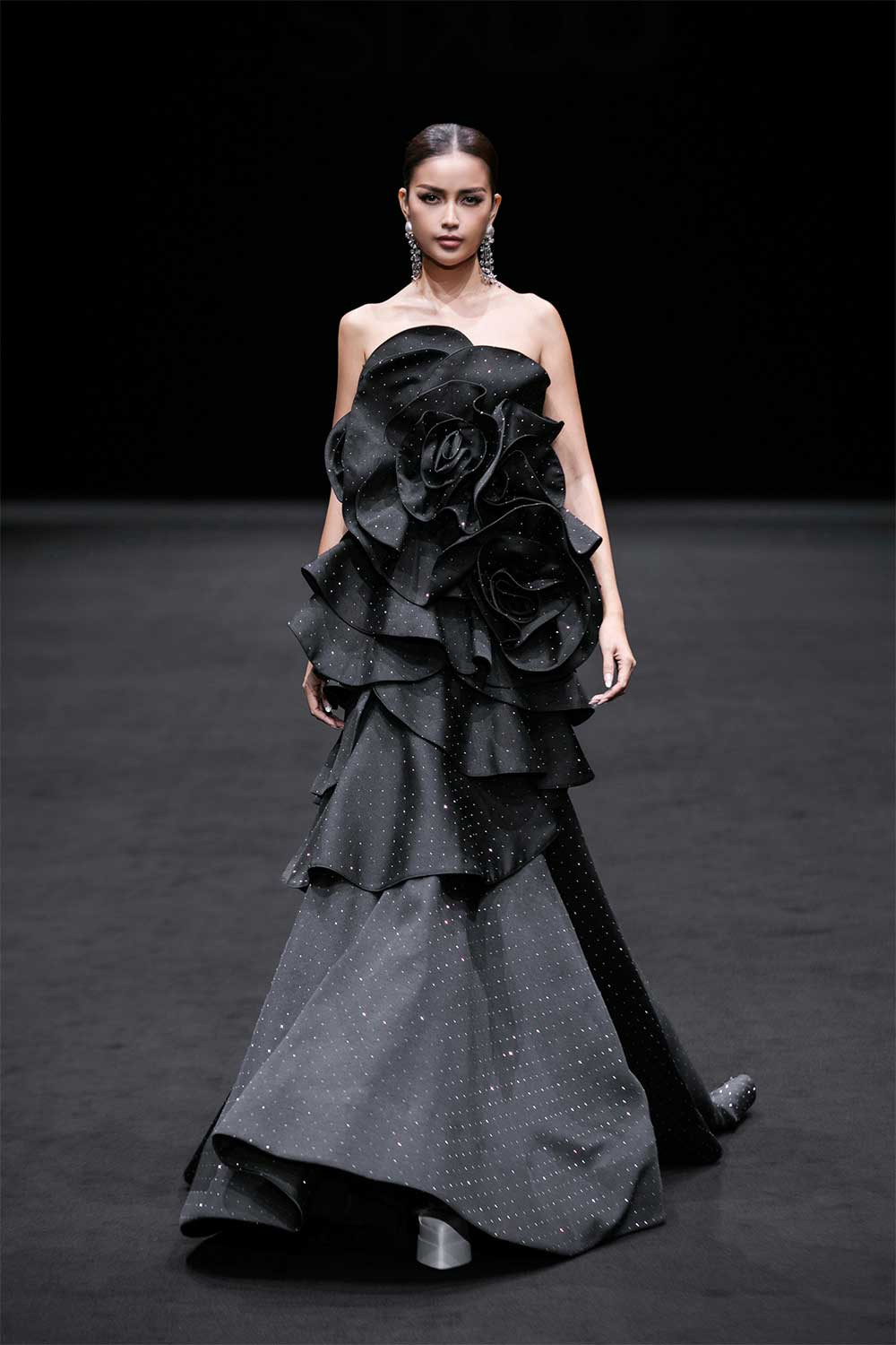 Hoa hậu Khánh Vân, Ngọc Châu… trình diễn các thiết kế ấn tượng, dù đôi lúc gặp khó khăn khi sải bước nhưng vẫn chinh phục khán giả bằng sự tự tin.