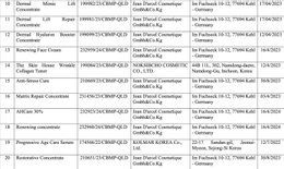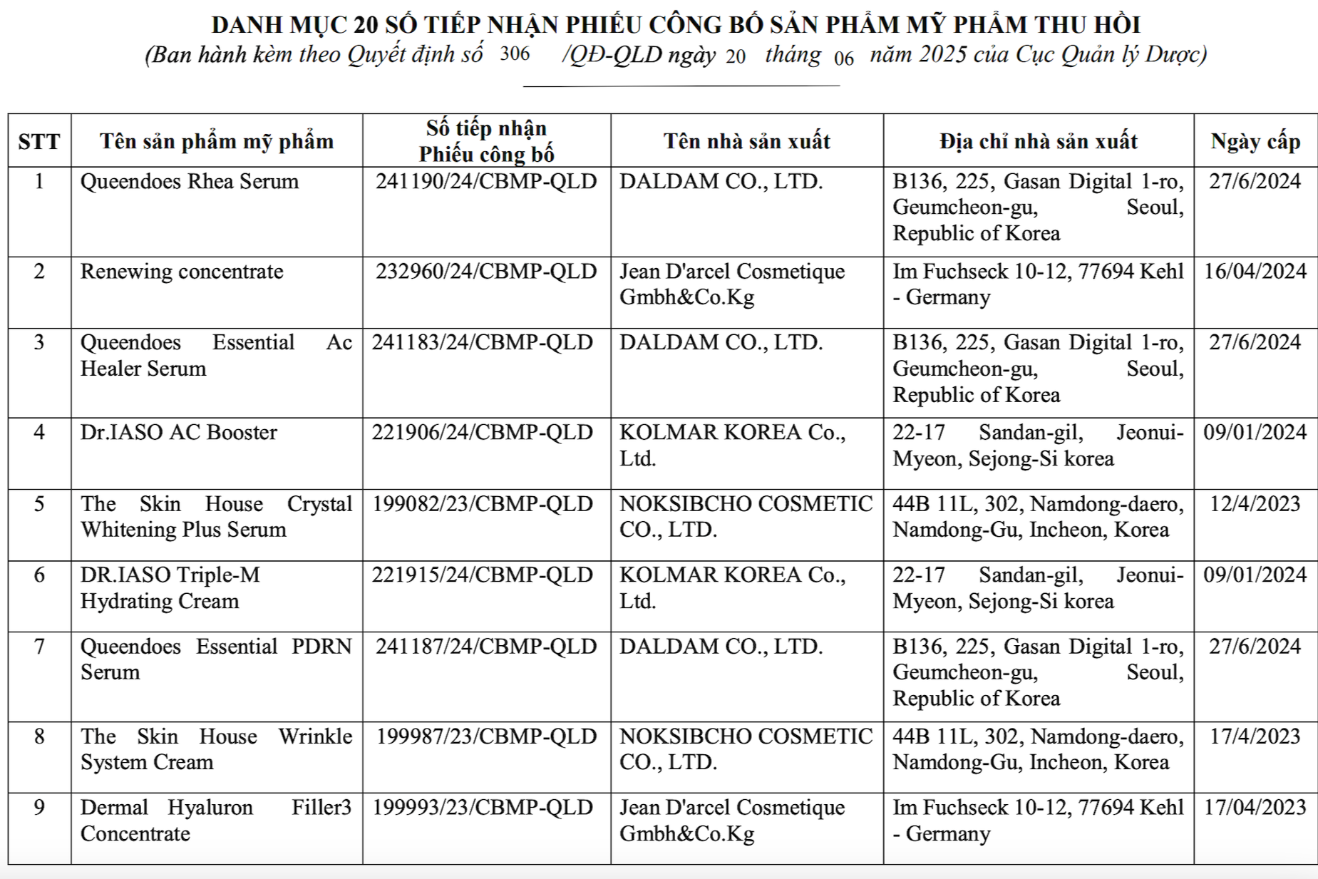 Trong đó, 2 loại mỹ phẩm chăm sóc da Queendoes Rhea Serum (số tiếp nhận 241190/24/CBMP-QLD) và Renewing concentrate (số tiếp nhận 232960/24/CBMP-QLD) bị thu hồi, tiêu hủy do lưu thông có công thức không đúng như hồ sơ đã công bố.