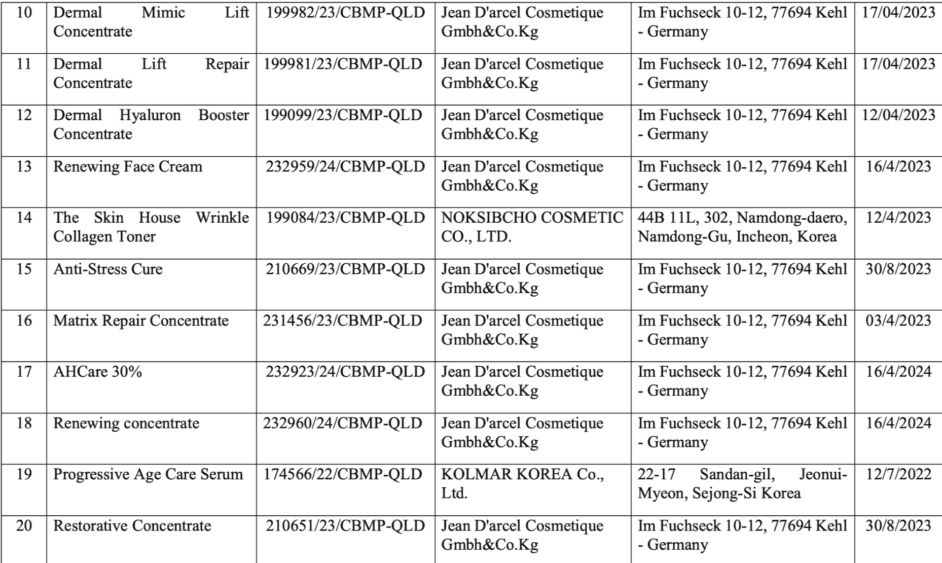 Cùng với quyết định đình chỉ lưu hành, thu hồi 20 sản phẩm do Công ty TNHH quốc tế Đại Cát Á chịu trách nhiệm đưa ra thị trường, Cục Quản lý Dược cũng thu hồi 20 số tiếp nhận phiếu công bố sản phẩm mỹ phẩm do Cục cấp đối với 20 sản phẩm này.