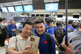 Các thành viên của ĐT Việt Nam có mặt tại sân bay quốc tế Suvarnabhumi, Bangkok làm thủ tục check-in. Toàn đội ai cũng hồ hởi trước giờ lên máy bay về Việt Nam.