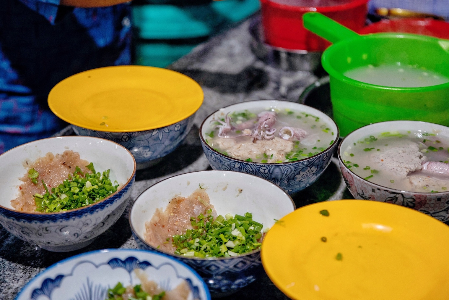 Một tô bún quậy thường có tôm, cá, mực tươi xay nhuyễn, hành ngò đã được xắt nhỏ, nước lèo, thêm gia vị rồi quậy đều cũng như để làm chín phần cá tôm.