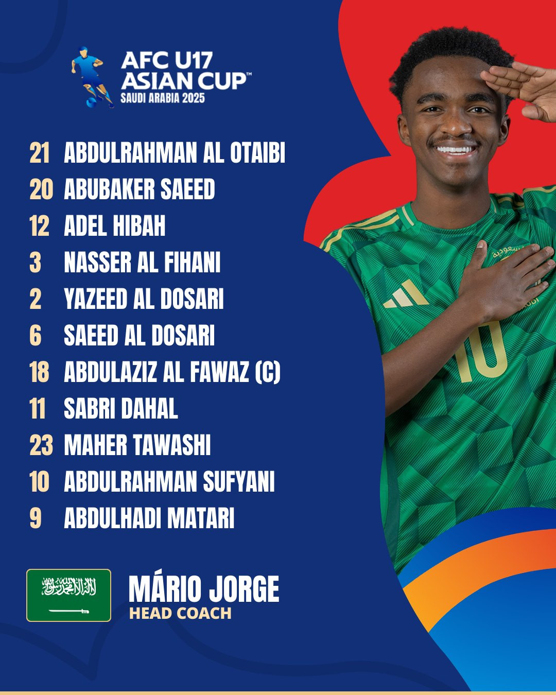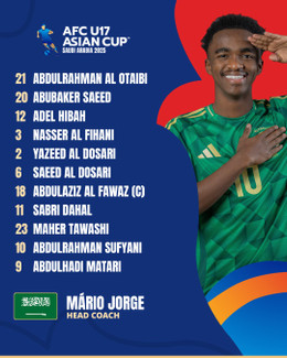 U17 Saudi Arabia: Abdulrahman Al-Otaibi, Yazeed Al-Dosari, Nassar Al-Fihani, Saeed Al-Dosari (Al-Walid Al-Awfi 64′), Abdulhadi Matari, Abdulrahman Sufyani, Sabri Dahal (Osama Al-Daghmah 74′), Adel bin Hibah (Salem Abdullah 74′), Abdul Aziz Al-Fawaz, Abu Baker Saeed