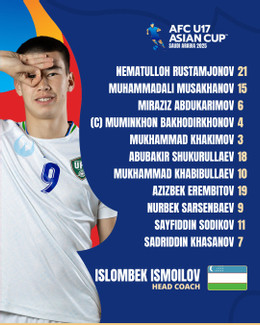 U17 Uzbekistan: Rustamjonov, Khakimov, Bakhodirkhonov, Abdukarimov, Khasanov (Rustamov 80′), Khabibullaev (Muradov 90′), Sarsenbaev, Sodikov (Asilbek Aliev 46′), Musakhanov, Shukurullaev (Saidmurodov 46′), Erembetov (Abdumuminov 75′)