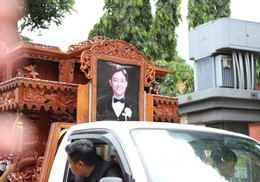 Gần 14h, linh cữu Quý Bình được đưa ra khỏi hội trường nhà tang lễ để lên xe tang. Ngọc Tiền – bà xã nam diễn viên cầm di ảnh dẫn đầu đoàn đưa tiễn.