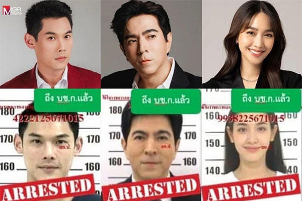 Ba người nổi tiếng bị bắt giữ gồm: diễn viên Min Pechaya, MC Kan Kantathavorn và Sam Yuranunt Pamornmontri. Bước đầu, họ đều phủ nhận các cáo buộc.